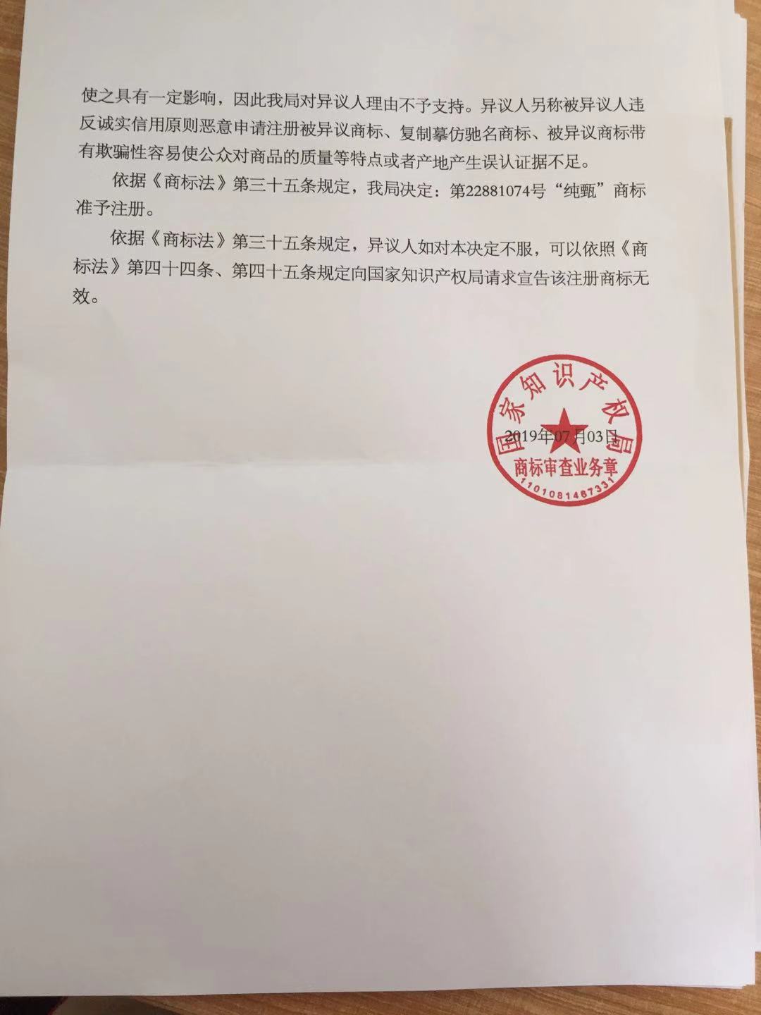 第22881074号“纯甄”商标准予注册的决定