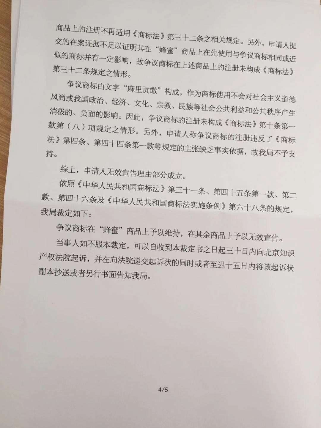 经审理认为,根据申请人提交的证据可以证明,申请人“麻里馓子MALISANZI及图商标在争议商标申请注册日之前在面包;糕点;甜食等商品上以被相关公众所熟知,重点是争议商标核定使用的谷类制食品;春卷;面粉等商品与引证商标核定使用的商品共属于同一种或类似商品,易使相关公众对商品来源产生混淆误认,已构成《商标法》第三十条、第三十一条所指的使用在同一种或类似商品上的近似商标。但是争议商标核定使用的“蜂蜜”商品与引证商标核定使用的商品不属于同一种或类似商品,未对引证商标产生影响。并且争议商标由文字“麻里贡馓”构成,而作为商标使用并不会对社会产生一定影响。因此,也未构成《商标法》第十条第一款第八项规定之情形。另外,申请人称争议商标的注册违反《商标法》第四条、第四十四条第一款等规定的主张缺乏事实依据,亦不予支持。