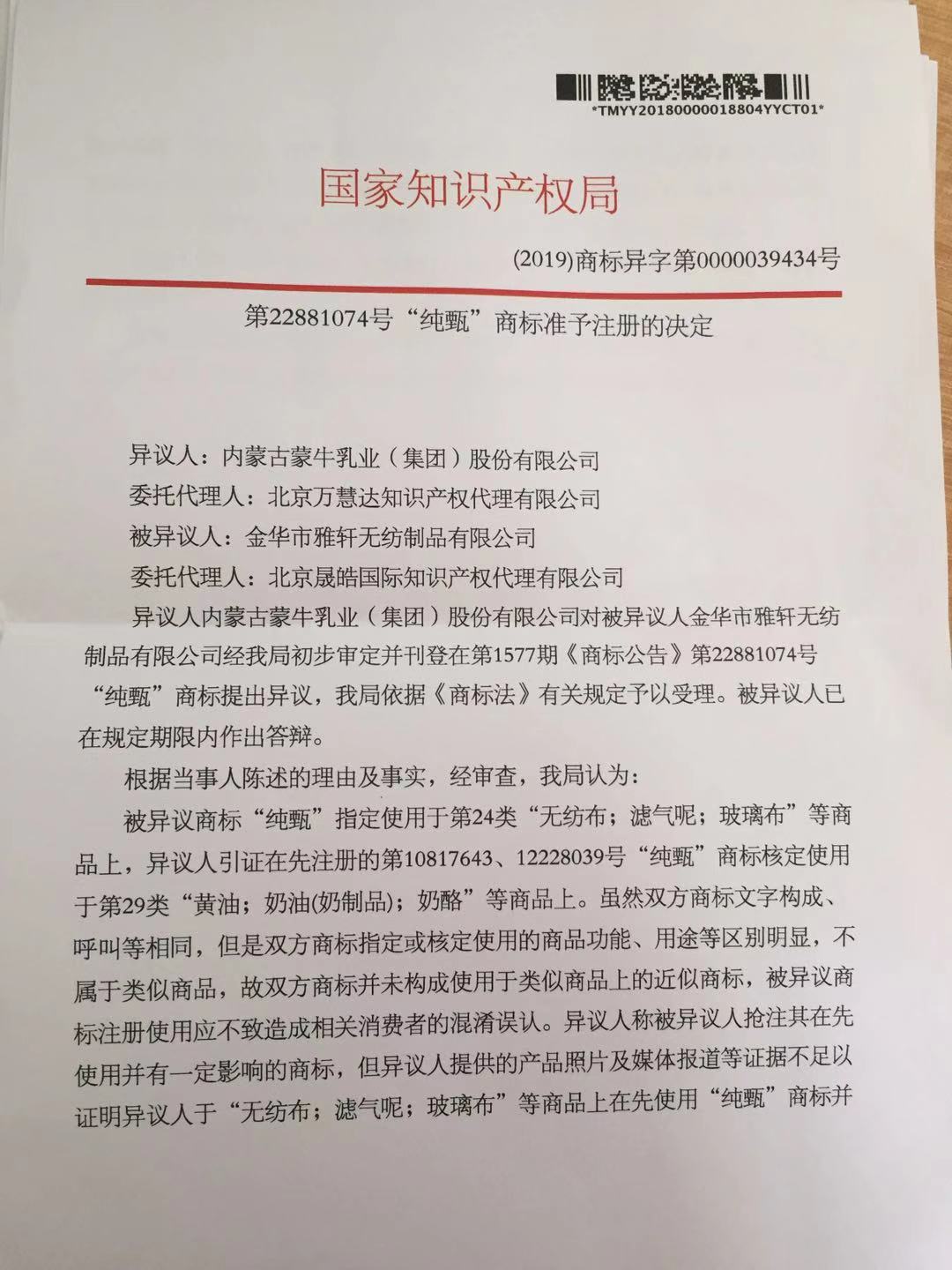 第22881074号“纯甄”商标准予注册的决定